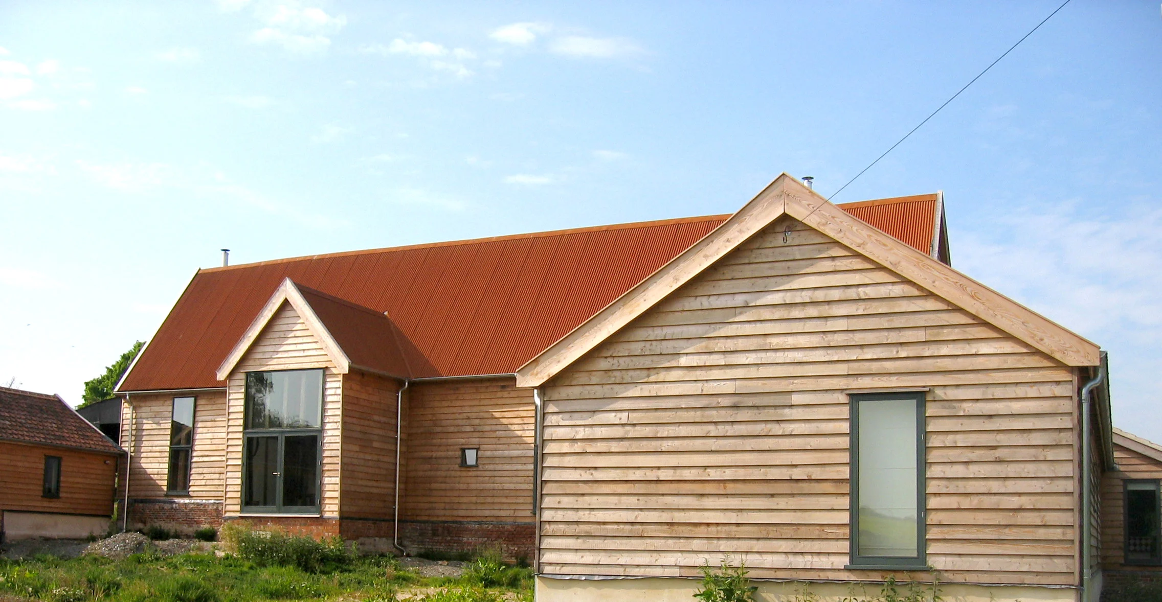 This barn retains the rugged appearance of a farm building, using rusty corrugated metal on the roof, unstained larch cladding, and stained softwood windows.